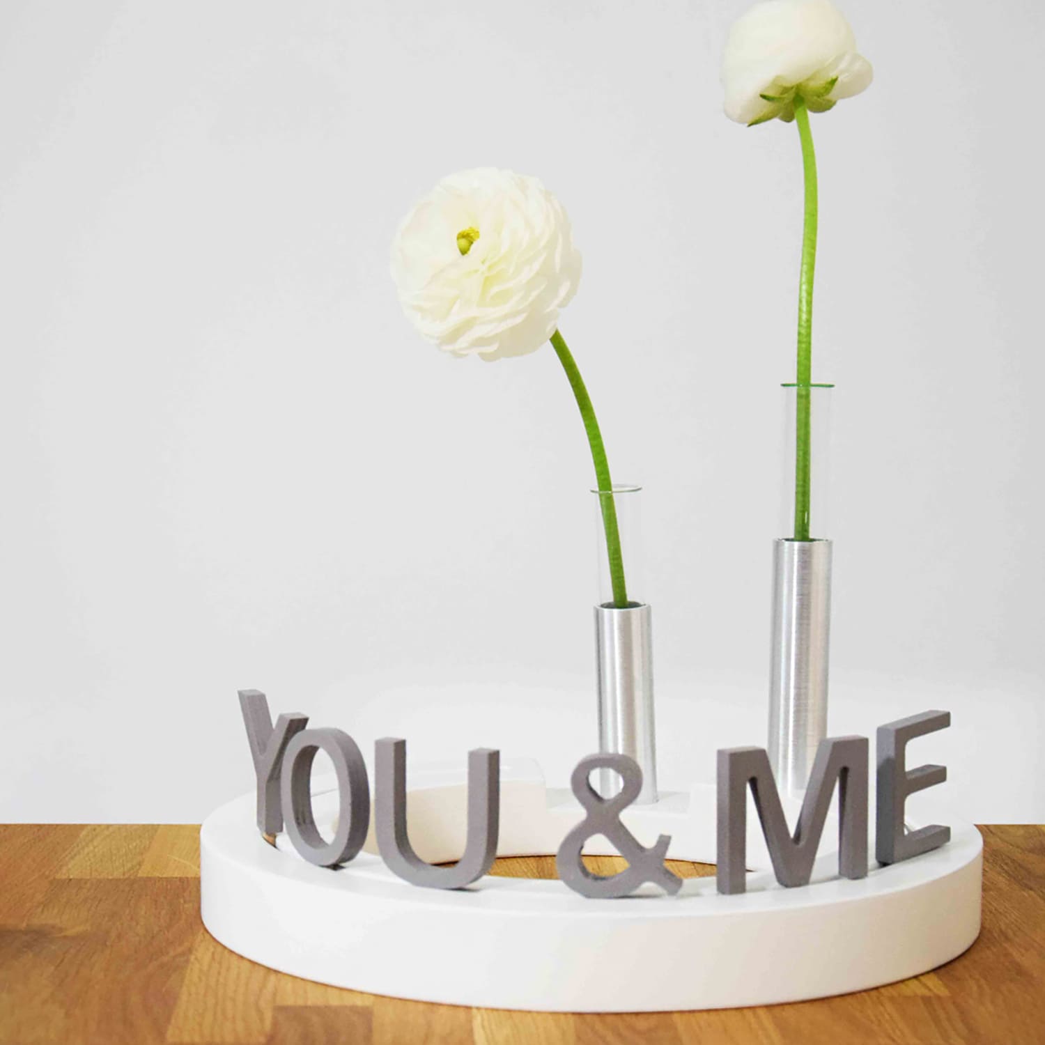 Die 5 cm hohen grauen Buchstaben YOU&ME aus Birkenholz können ganz leicht auf den individuell gestalteten Tischkranz aufgesteckt werden, so dass Form, Farbe und Wort eine harmonische Einheit darstellen, die einen Raum zum Sprechen bringt.