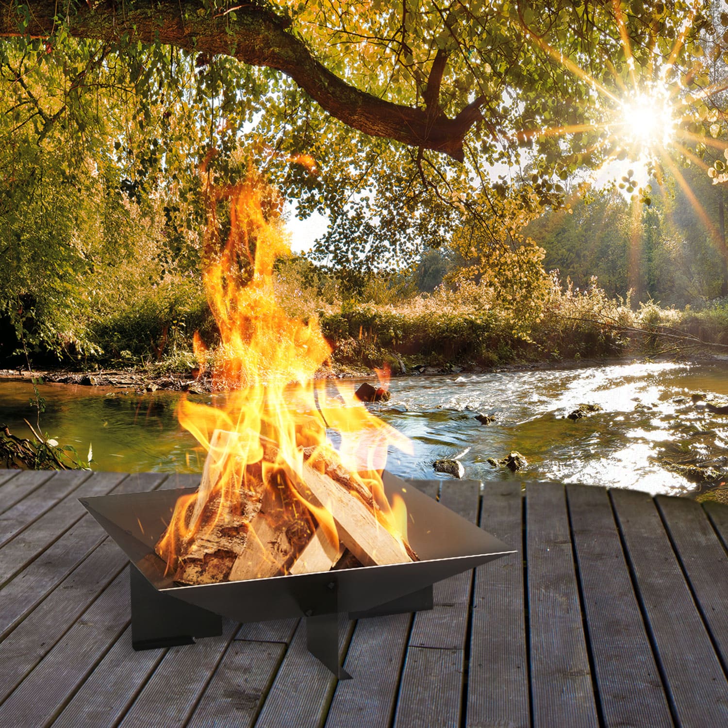Quadratische Feuerschale mit außergewöhnlichem Gestell.