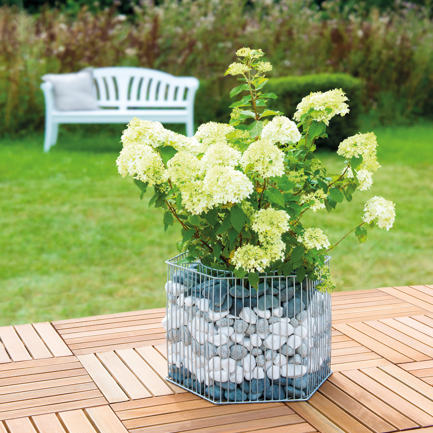 Der sechseckige, ca. 32,5 cm hohe Gabionen-Pflanztopf aus 100 % feuerverzinktem Stahl ist einfach zu befüllen, da er über einen inneren Korb verfügt, der mit einem schwarzen Kunststoff-Einsatzpflanztopf ausgestattet ist.