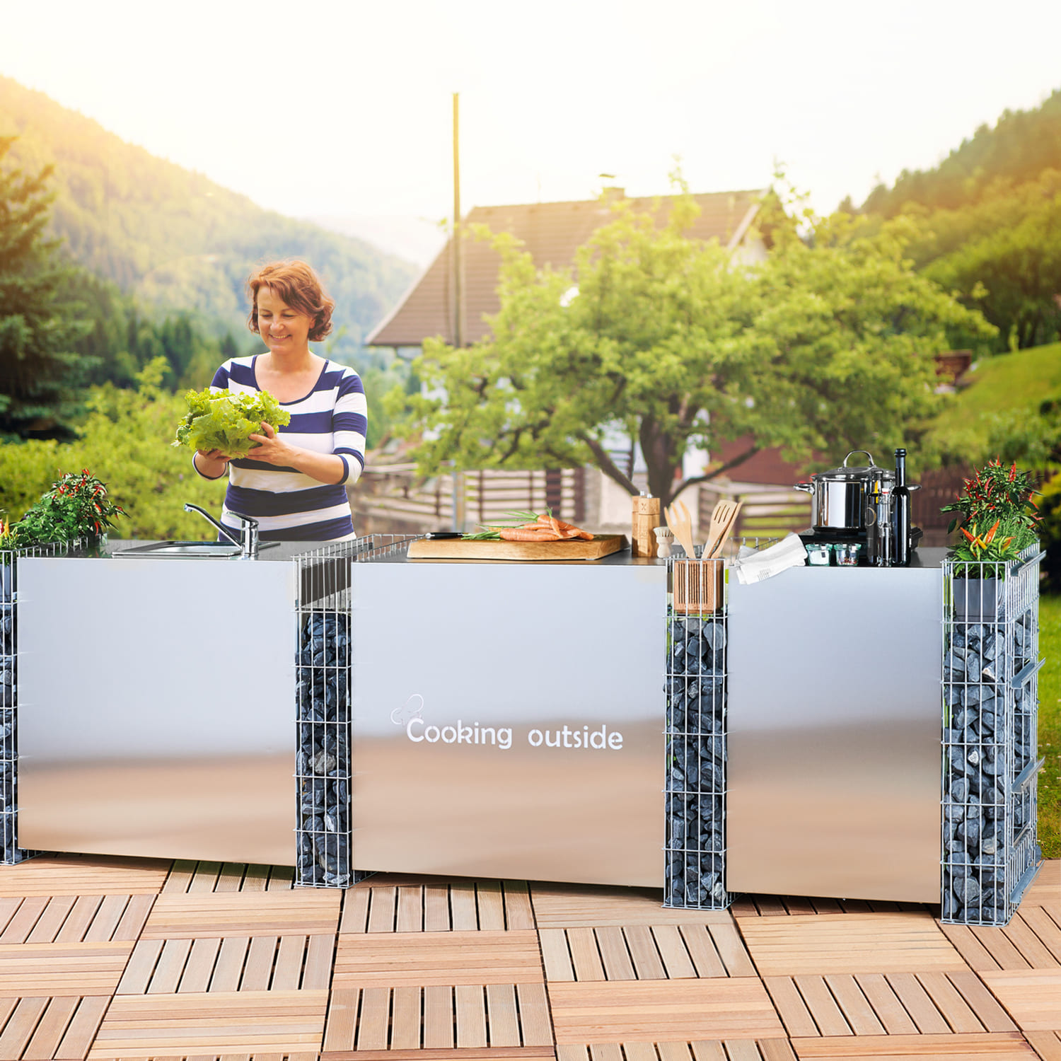 Outdoor-Küchen werden immer beliebter. Denn die Freilichtküche bietet viele Möglichkeiten, ein vielseitiges kulinarisches Angebot zu kreieren – und das direkt unter freiem Himmel. So kann auf der Gartenparty und dem Grillabend gemeinschaftlich geschnibbelt, gekocht und daneben noch ganz entspannt mit Freunden und Familie geplaudert werden. Auf diese Weise wird der eigene Garten in der warmen Jahreszeit zur wahren Wohlfühloase, wo das schöne Wetter und die selbst zubereiteten Köstlichkeiten gleichzeitig genossen werden können. Aber nicht nur schönes Wetter, frische Luft und köstliche Lieblingsspeisen garantieren Genuss im eigenen Garten – auch das geschmackvolle Erscheinungsbild der Outdoor-Küche regt Appetit und gute Laune an. Optisch stellt die zeitlos elegante Outdoor-Küche mit ihrer Front und den Arbeitsflächen aus Edelstahl ein echtes Highlight dar. Die seitlichen modern gestalteten Gabionenelemente geben der Küche eine hohe Standsicherheit und ermöglichen es, die Outdoor-Küche nach individuellem Geschmack zu gestalten. Insbesondere der durchdachte Aufbau unserer Outdoor-Küche mit den einzelnen Modulen, großzügig bemessenen Arbeitsflächen sowie nützlichen Ablageflächen machen das Agieren an der Küche besonders komfortabel. Unser Tipp: Auch in der kalten Jahreszeit, wenn die kühle Witterung den Appetit auf deftigere Speisen anregt, lassen sich auf der wetterbeständigen Outdoor-Küche köstliche Herbst- und Winterspeisen zubereiten. Denn dank des hochwertigen Edelstahls der Küchenelemente sowie des feuerverzinkten Stahls der Gabionen ist sie besonders widerstandsfähig.