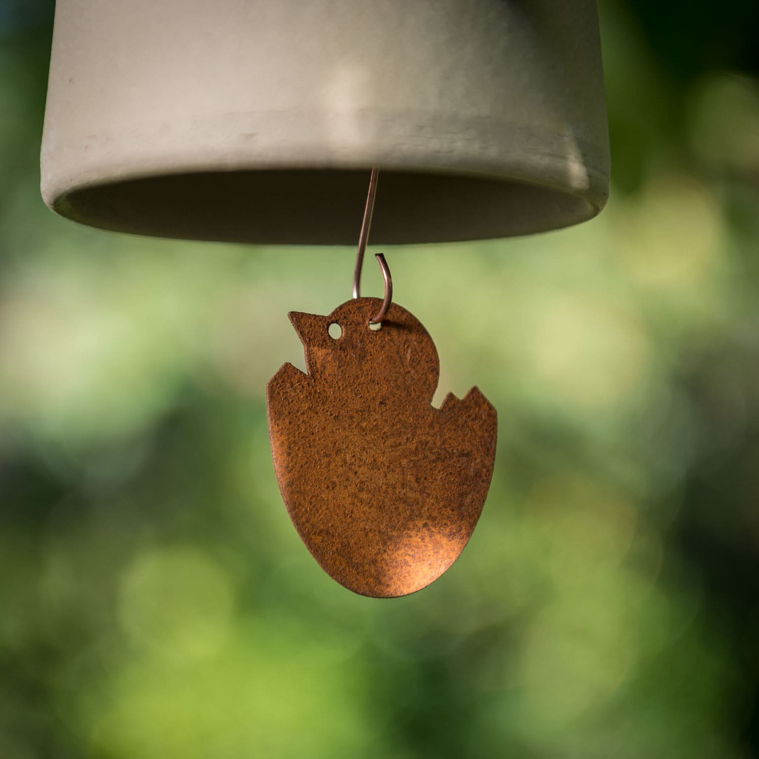 Die komplett in Handarbeit gefertigte Tonglocke ist oben mit einem Ring ausgestattet, an dem die 15 cm hohe und ca. 400 g schwere Meisenglocke in Bäumen oder an anderen geeigneten Orten aufgehängt werden kann. Im Inneren des Meisenknödelhalters befindet sich außerdem ein langstieliger Haken aus verzinktem Stahl, an dem der Meisenknödel aufgehängt werden kann. Sollen in der Sommerzeit die tierischen Freunde einmal nicht gefüttert werden, so kann durch das Anhängen der beiliegenden Metallapplikation in Form eines Vogels oder eines Sterns die Futterstation zum wohltönenden Windspiel umfunktioniert werden.Highlight der handgefertigten Meisenglocke