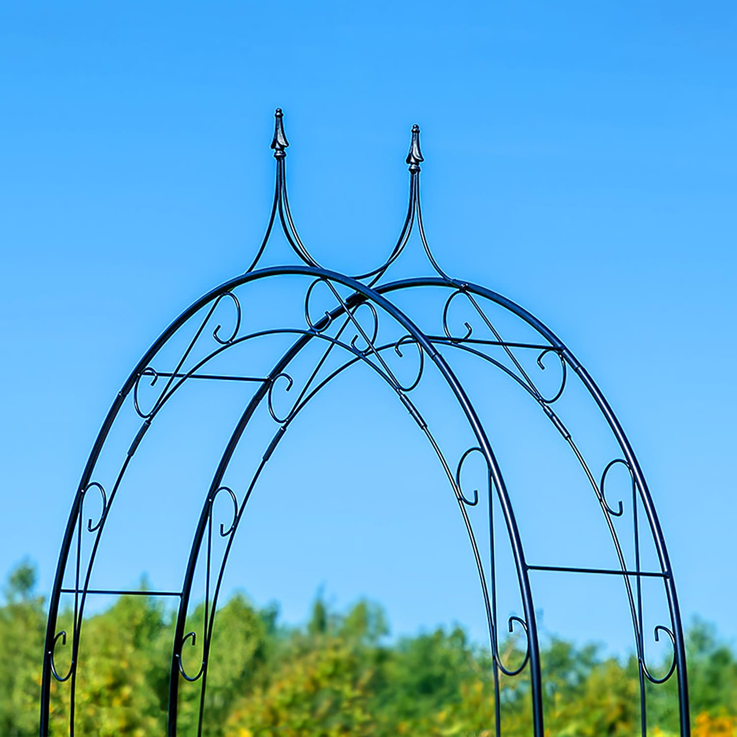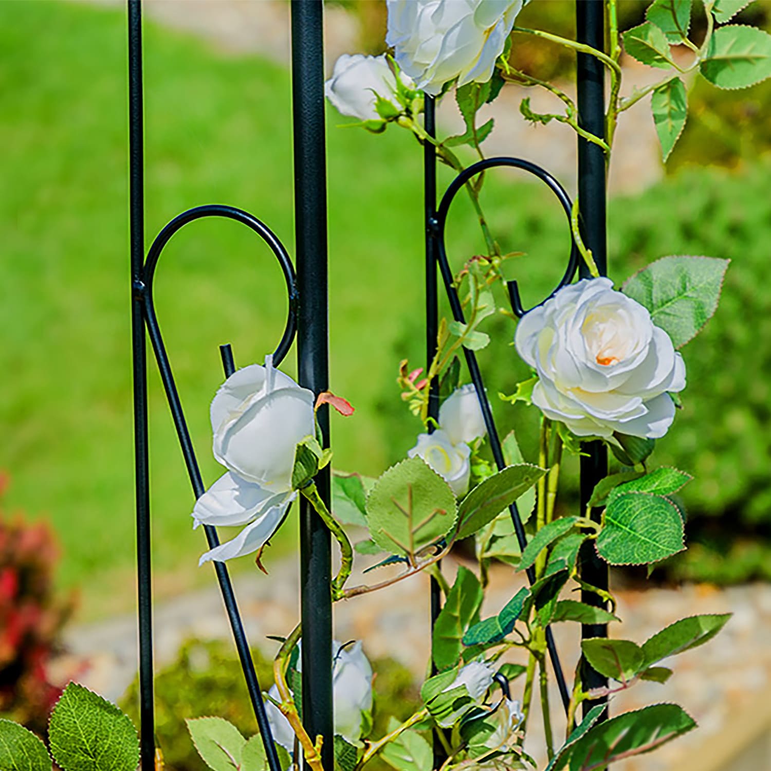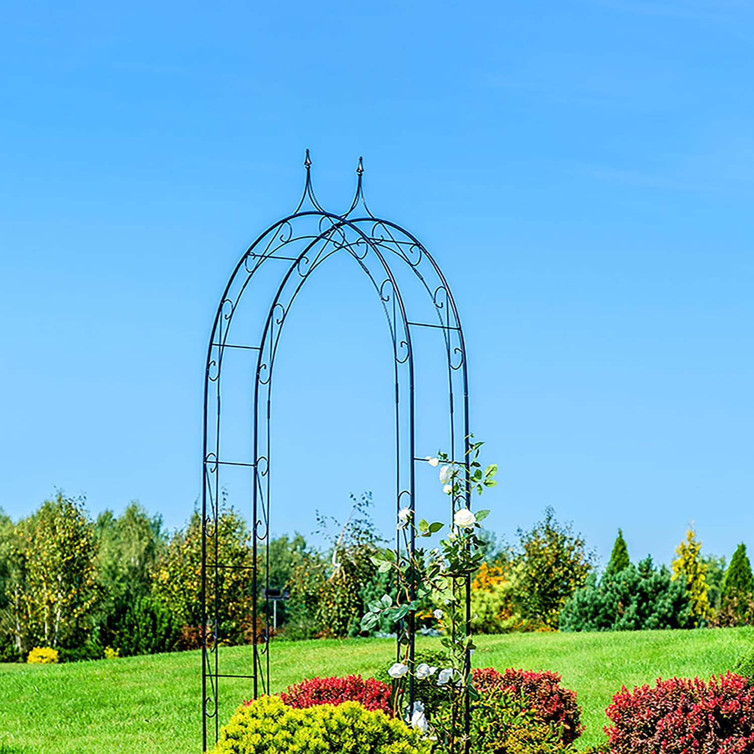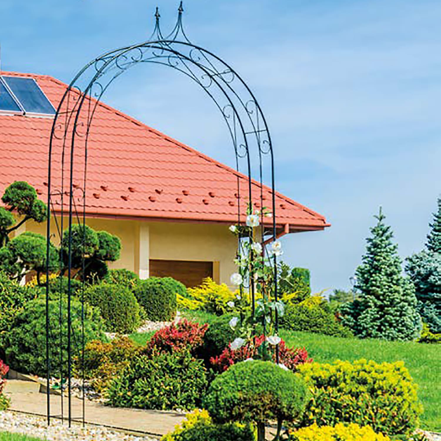 Die antik-silberne Farbgebung in Hammerschlag macht den Rosenbogen schnell zu einem schönen Blickfang in jedem Garten. Auch die doppelte Bogenführung, die geschwungenen Verzierungen darin sowie die beiden Spitzen auf dem Kletterpflanzenbogen sorgen für eine romantische Optik. Richtig platziert und schön bewachsen stellt die Kletterpflanzen-Rankhilfe ein zentrales Element Ihrer dekorativen Gartengestaltung dar.