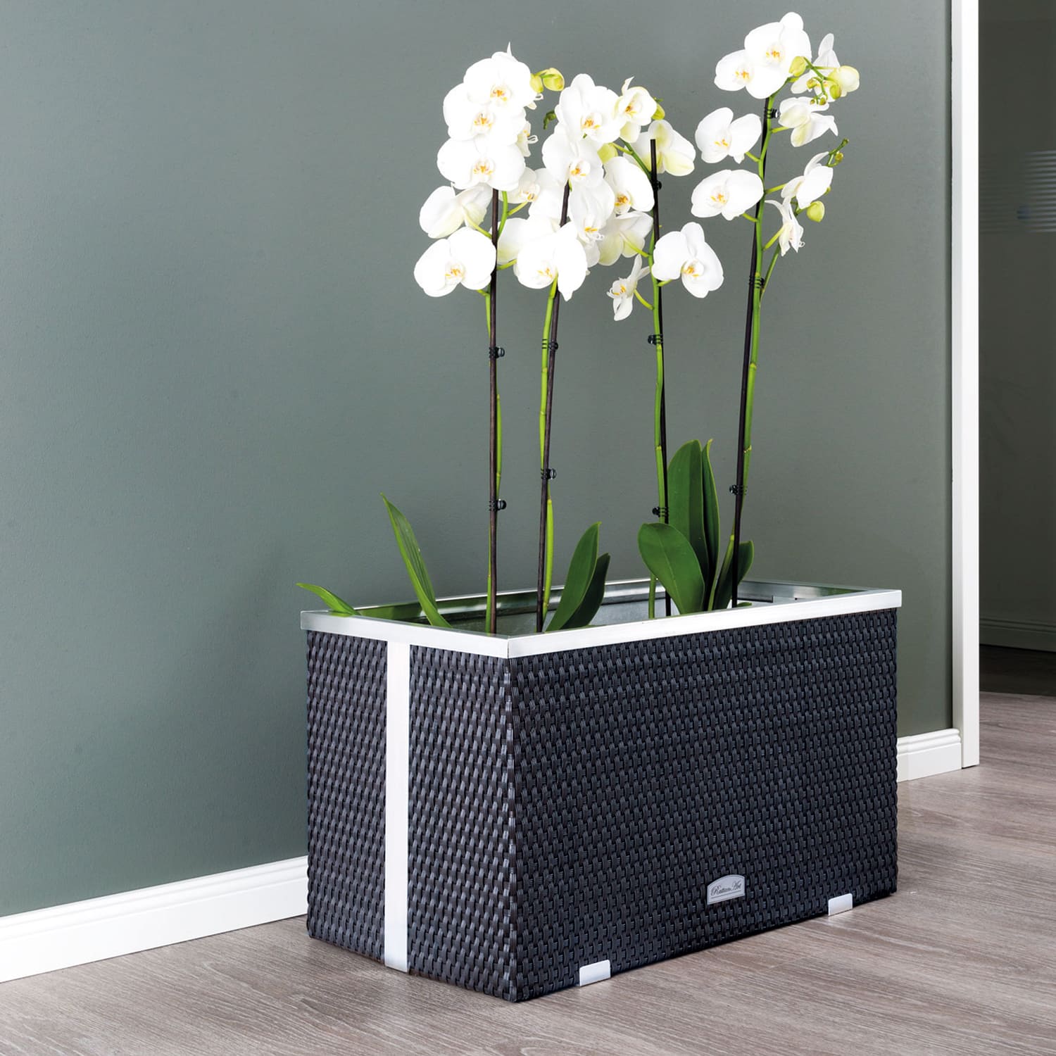 - 1 x Rattan-Pflanzgefäß mit Alubeschlägen Anthrazit 70 x 38 x 40 cm